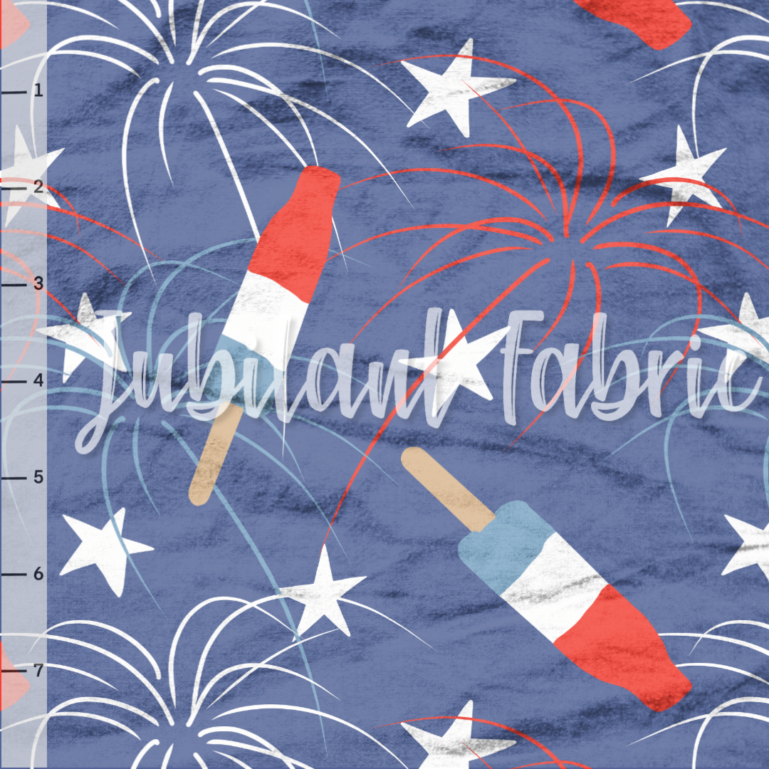 Hand drawn b.pop Popsicles with coordinating fireworks on a blue background